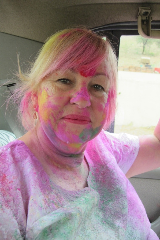 Then Ashok stopped the car, grabbed a bag of colour and walked back to another group of men. He was chatting to them and they were all blessing each other, so we decided to get out of the car and take photos of the proceedings. Within seconds we had a big group of men surrounding us and blessing us with colour. They were fine though … very respectful … just painting our faces and feet and wishing us Happy Holy. Although one guy managed to throw some at me which went into my eyes and mouth and I spluttered. Then one guy decided to give me a hug … all good … no hassles or drama. Then Ashok came back to the car and said we should head off.