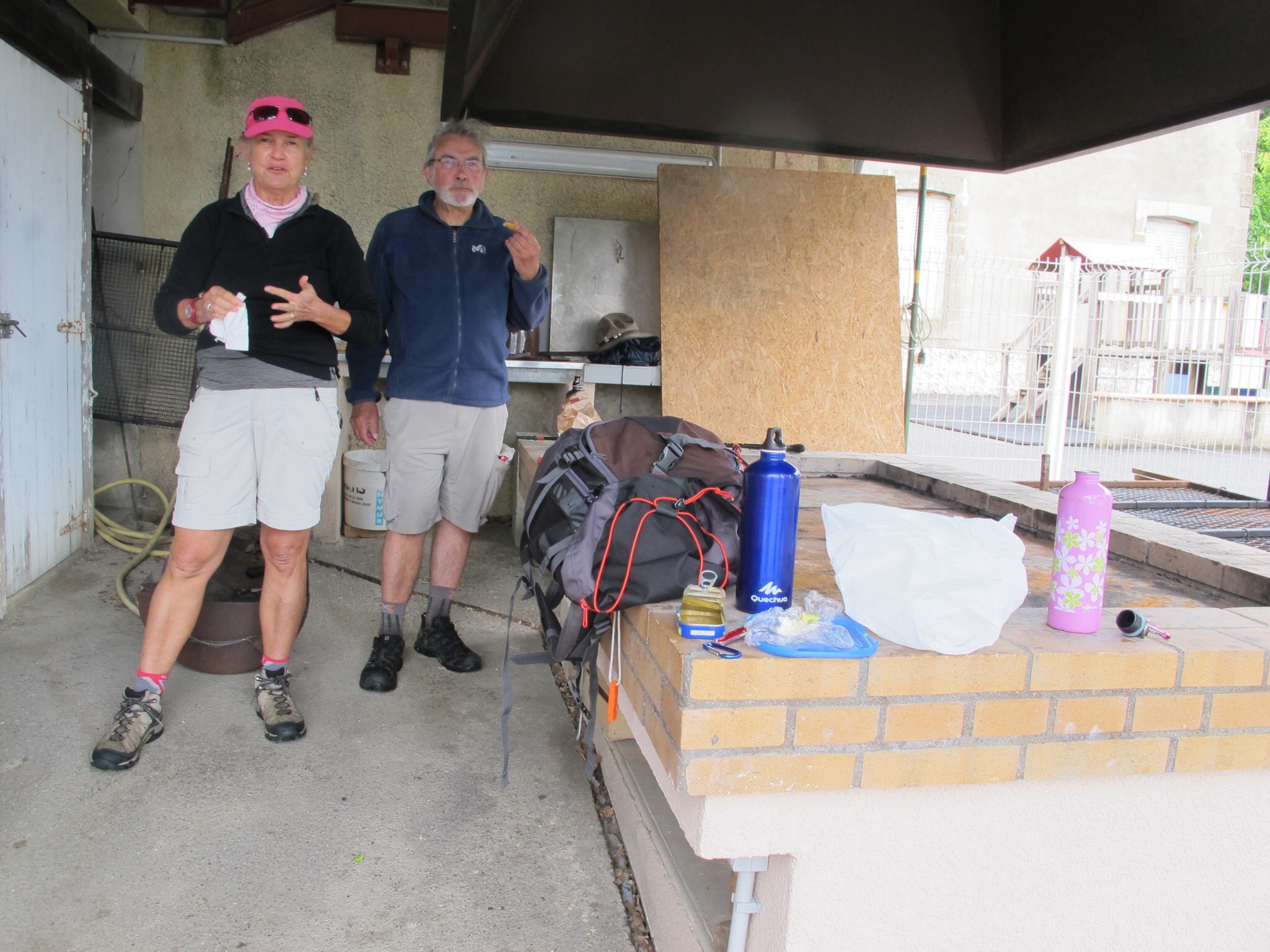 Wednesday 4 June it rained most of the day. We walked with Hugues and just sat down at a picnic table for lunch when the heavens really opened up and we had to find shelter in a grubby area where a very large public bbq was … consequently lots of soot, but we survived.