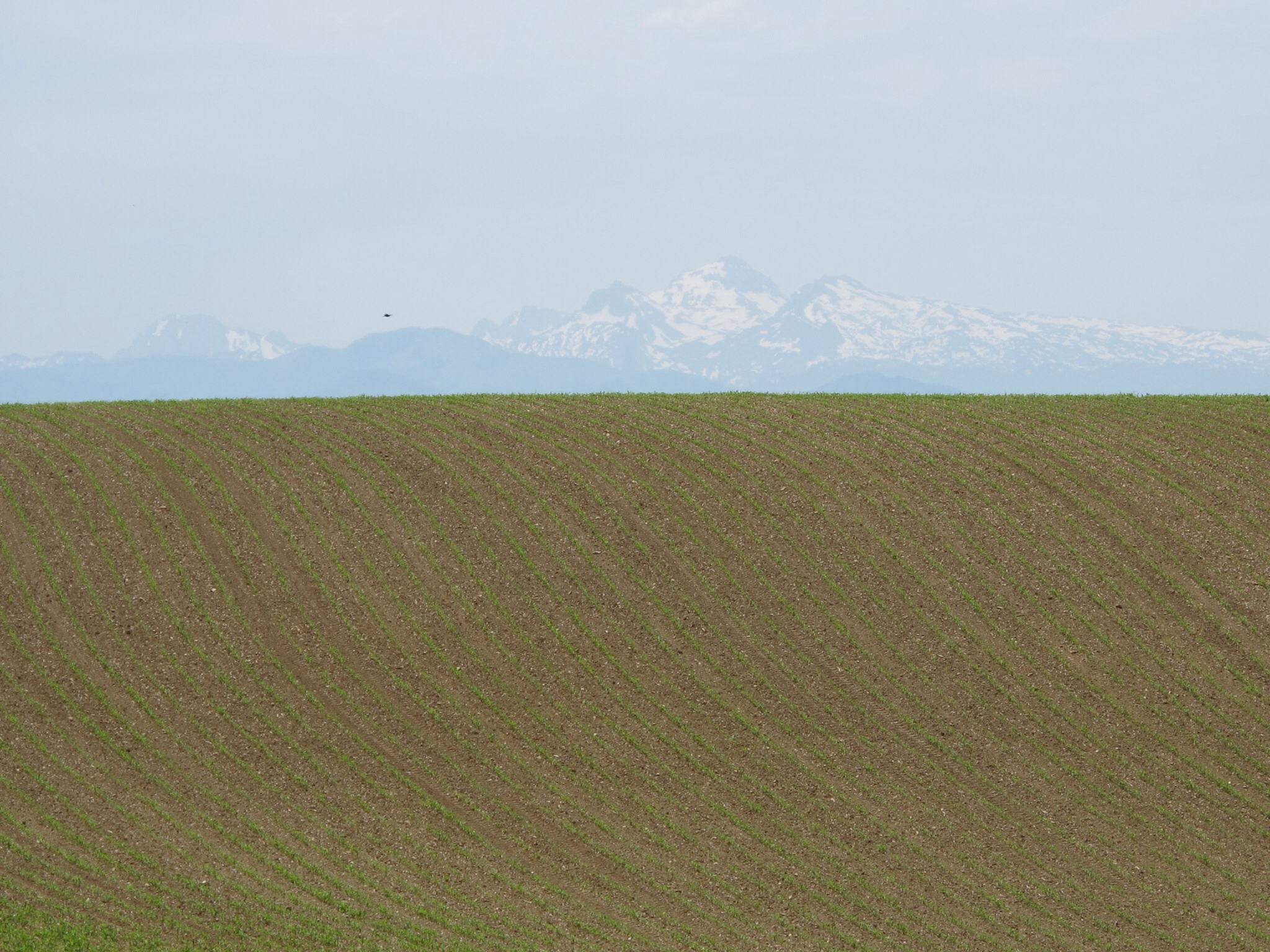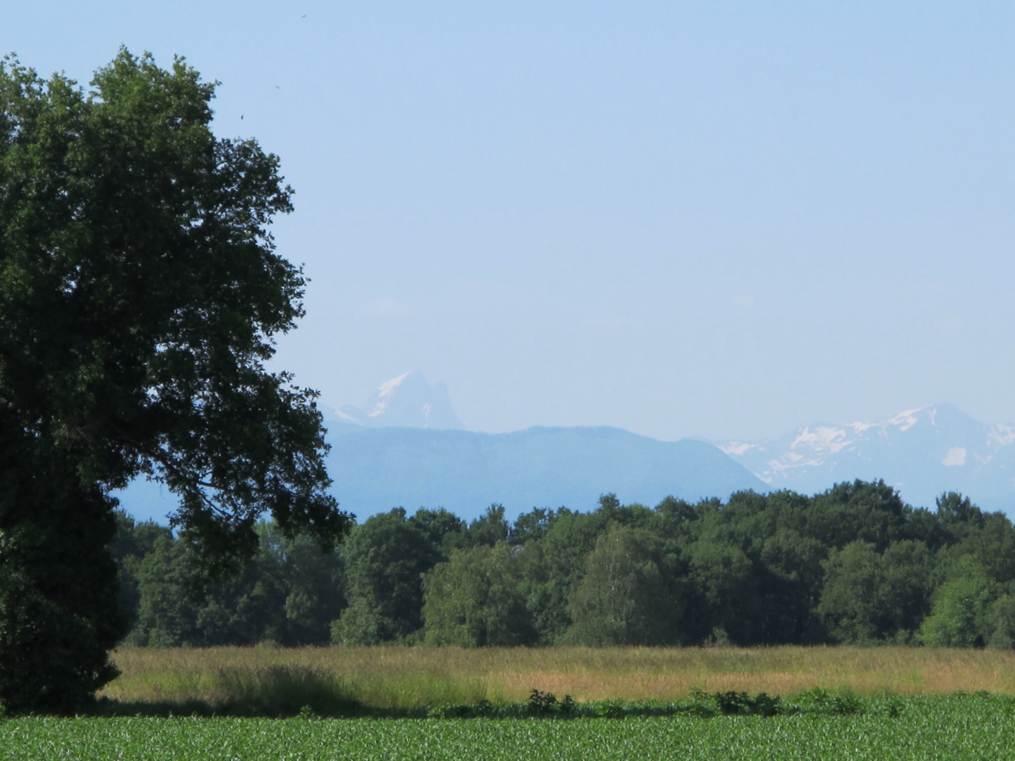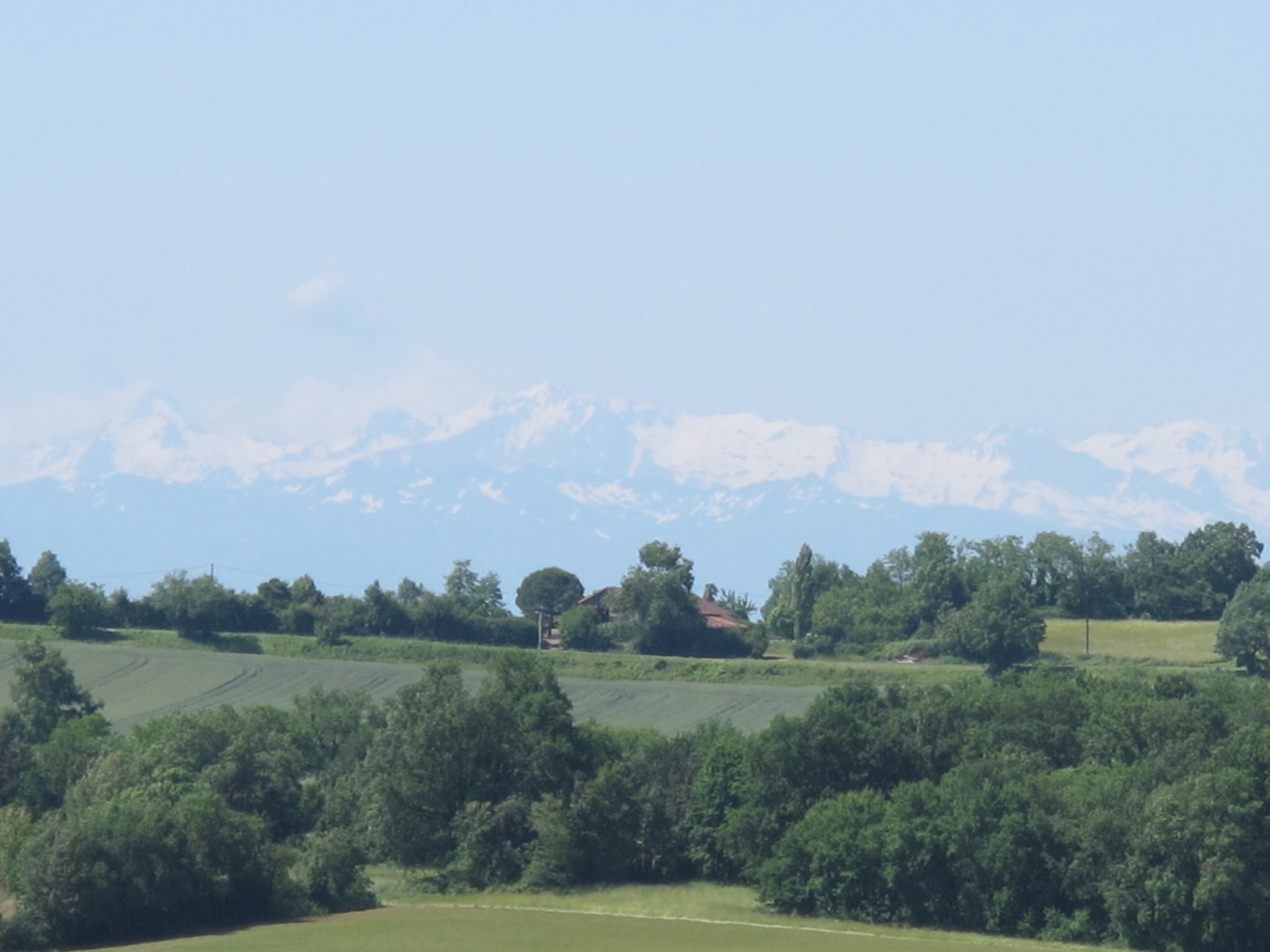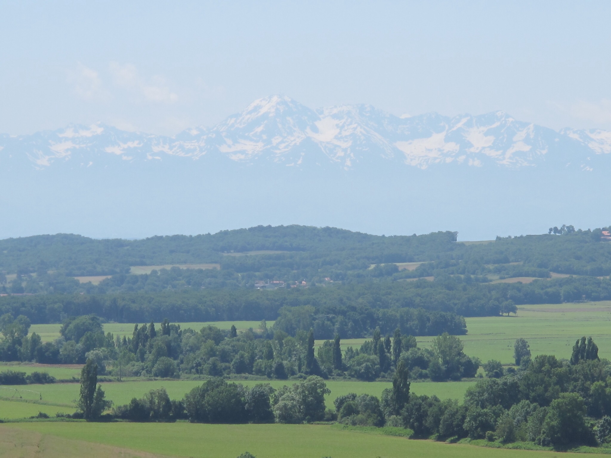 We met at 10 am but managed to fiddle around in the town until 11.30 am when we started our 18 km for the day. When we walked out of Marciac there was a rather large hill. At the top MR walked into a paddock to take photos of Marciac as there was a great view. I turned around and walked over the other side and there laid out in front of me were the very snow capped Pyrenees. They looked spectacular! We were pretty awe struck as we knew that we had to walk over them eventually!