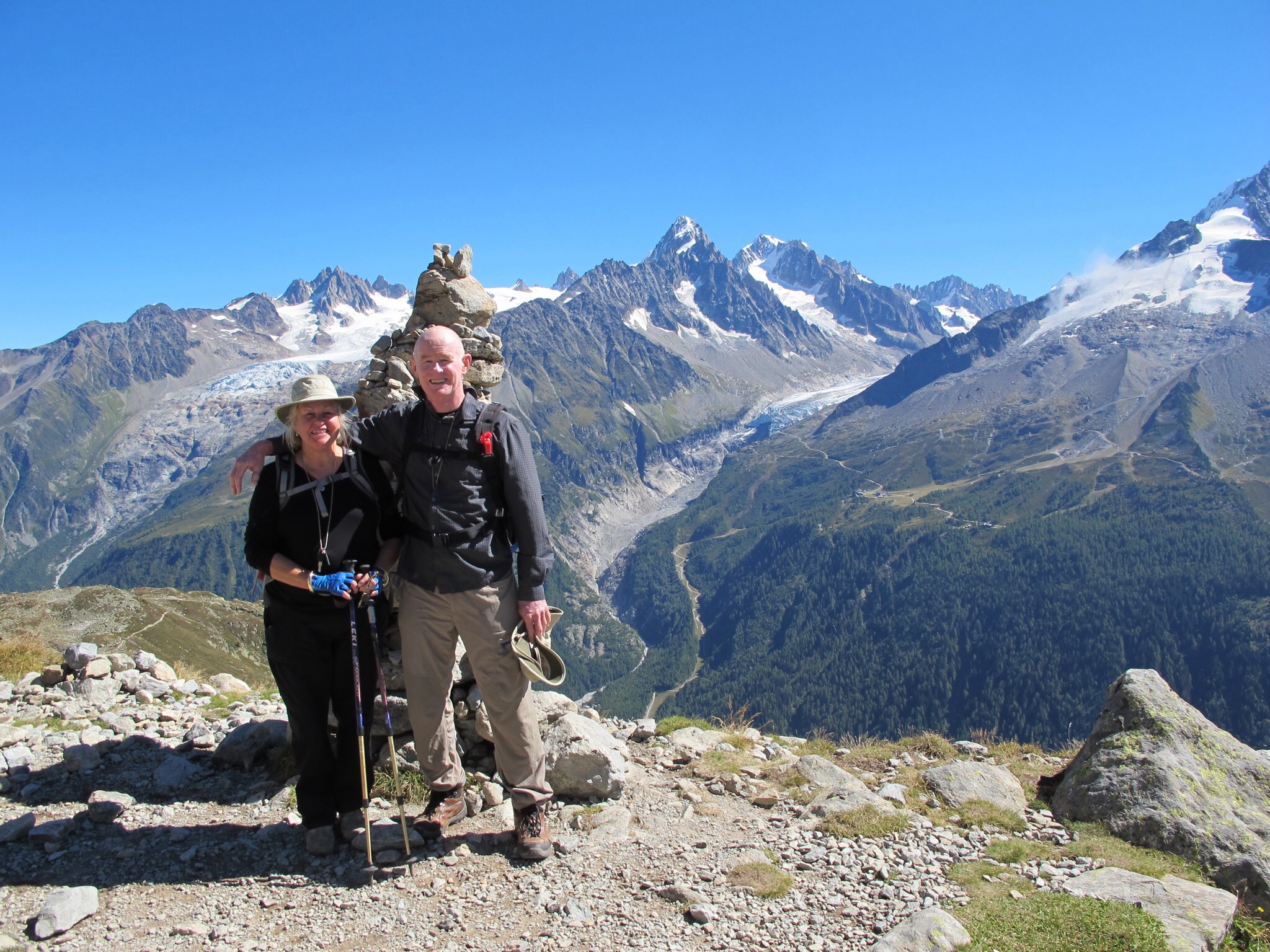 This photo was taken while trekking in Chamonix. It is a fabulous area and we were lucky enough to have fantastic weather. The trekking was really tough for me though and even though John had planned on doing the complete Haute Route I knew I wouldn’t be capable of it. Needless to say he realised pretty quickly what I was capable of and we just did day walks … even they were tough, but I still enjoyed it.