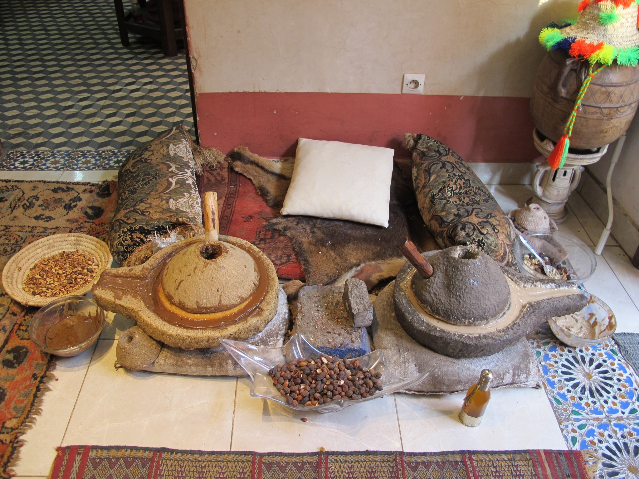 This is how argon oil is made … from the nuts of the argon tree. On the left the nuts have been roasted before being ground. This is used for eating and cooking. On the right the nuts are raw and this is used for oil for hair and cosmetics.