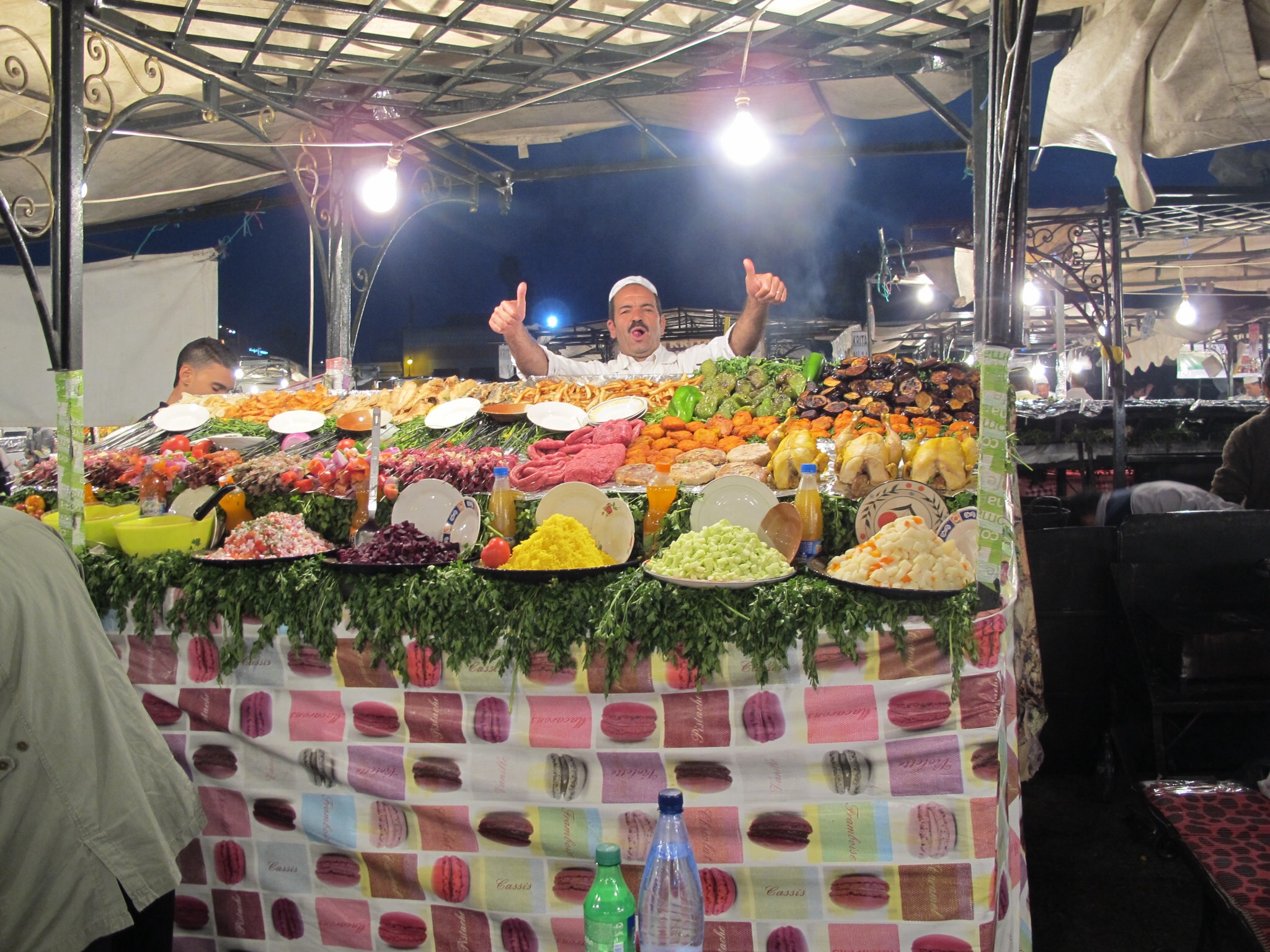Evening in the square is a whole different scenario and quite a hoot. It was serious theatre as we walked around the fifty odd food stalls, basically all selling the same thing but acting out different forms of theatre to try and get you in. When they do rope a couple of people in there are huge hoops of clapping and laughter welcoming the new guests. We shared a plate of mixed seafood which was really rather delicious. The salads looked great but I have too much respect for my stomach to eat salads in Morocco. Cooked food only for this little black duck.