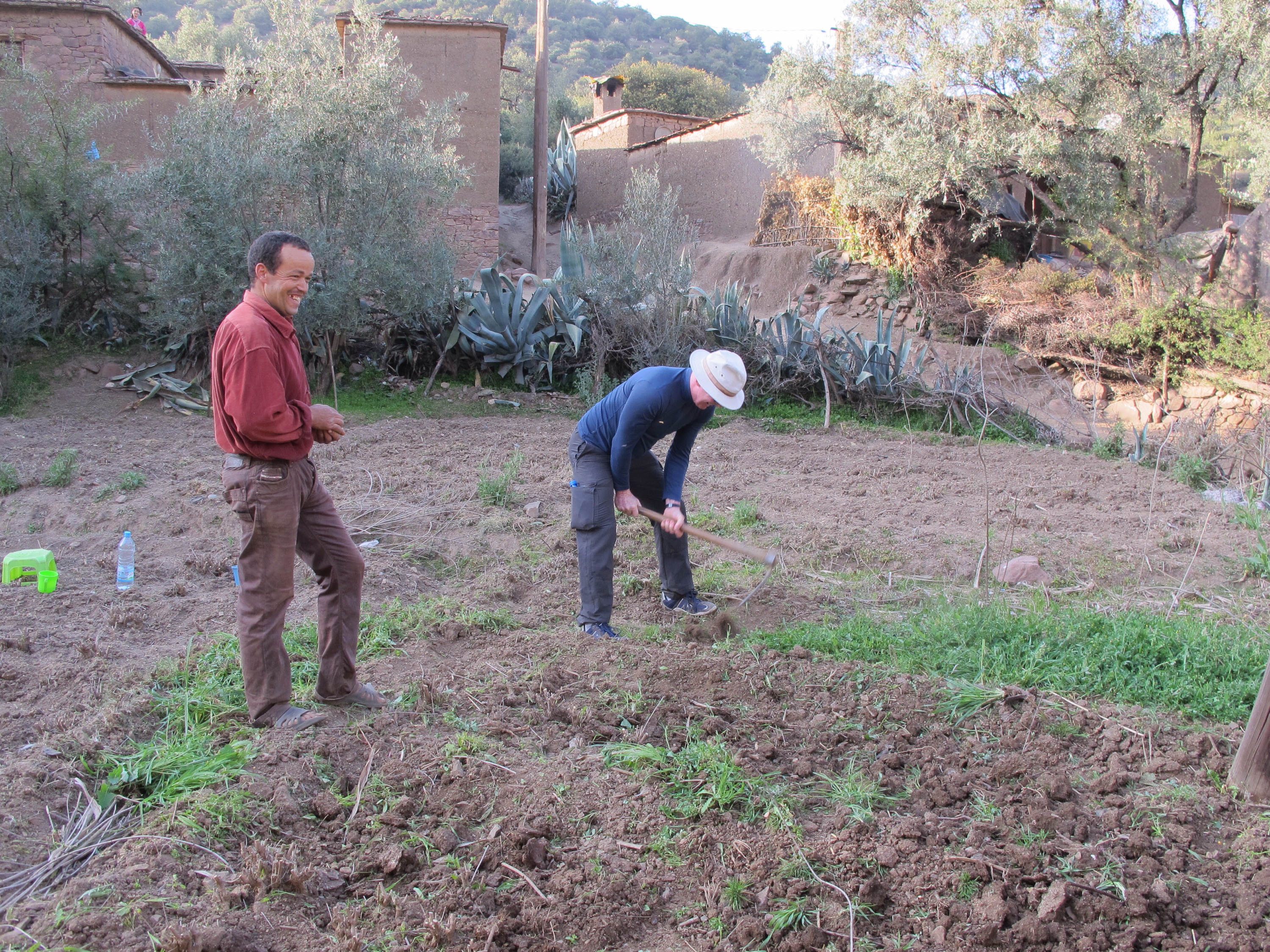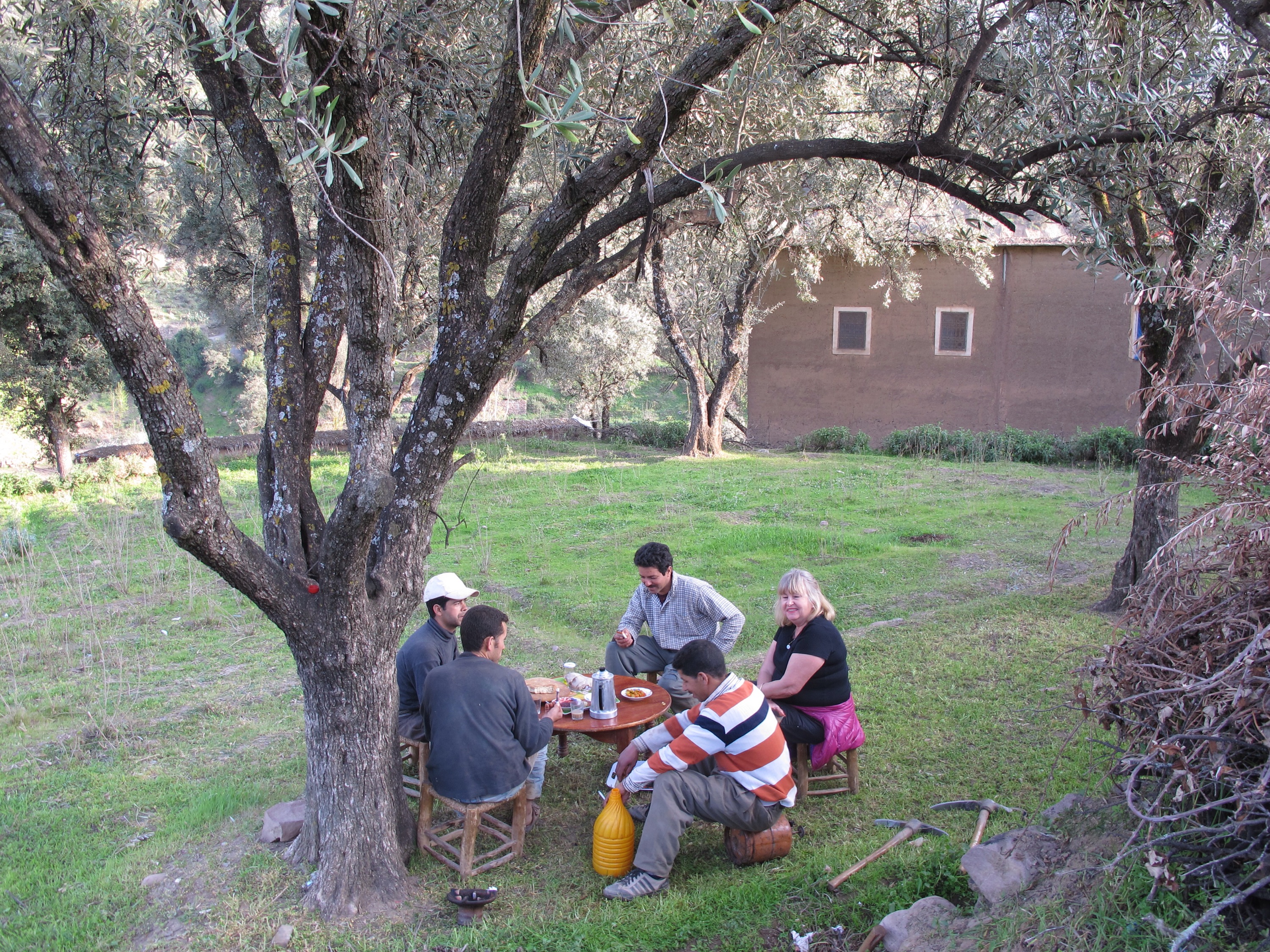 On our way back a lovely fellow called us over laughing and John helped him with some digging in his paddock. He thought that this was really funny. A little further along John waved at some men sitting under a tree having afternoon tea. One of them came after us and insisted that we join them. I know that it is a very unflattering photo of me that John took but it was one of my favourite moments in Morocco. They could speak a few words of French and so could we. They insisted on us sharing their afternoon tea which was delicious. Lovely flat bread with really good strawberry jam, great olive oil in a saucer and fabulous olives. I am not a great olive lover but really enjoyed the Moroccan ones. All washed down with the most delicious sweet milky coffee that I have ever drank. We asked if they had children and three out of the four brothers did. So John pulled out all of his coins and said pour les enfants. I am completely certain that that wasn’t why they called us over but we thought it was the least that we could do. They really were lovely friendly people.