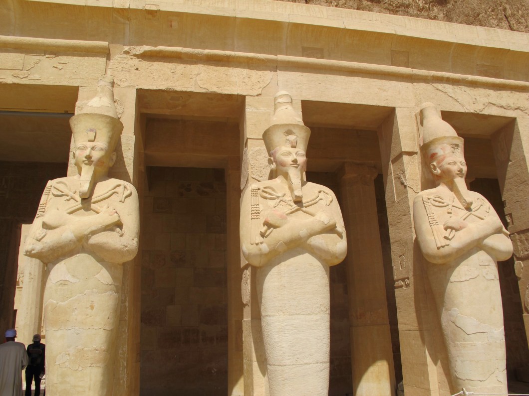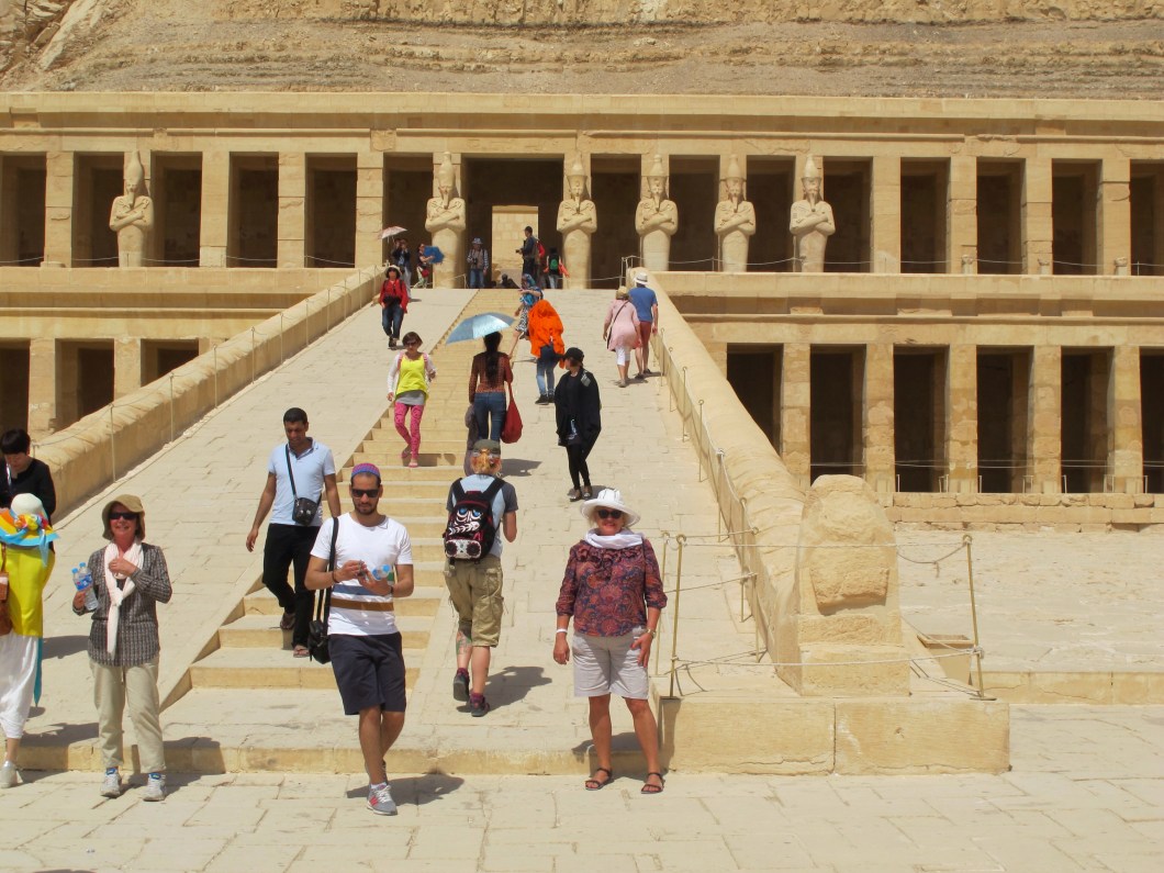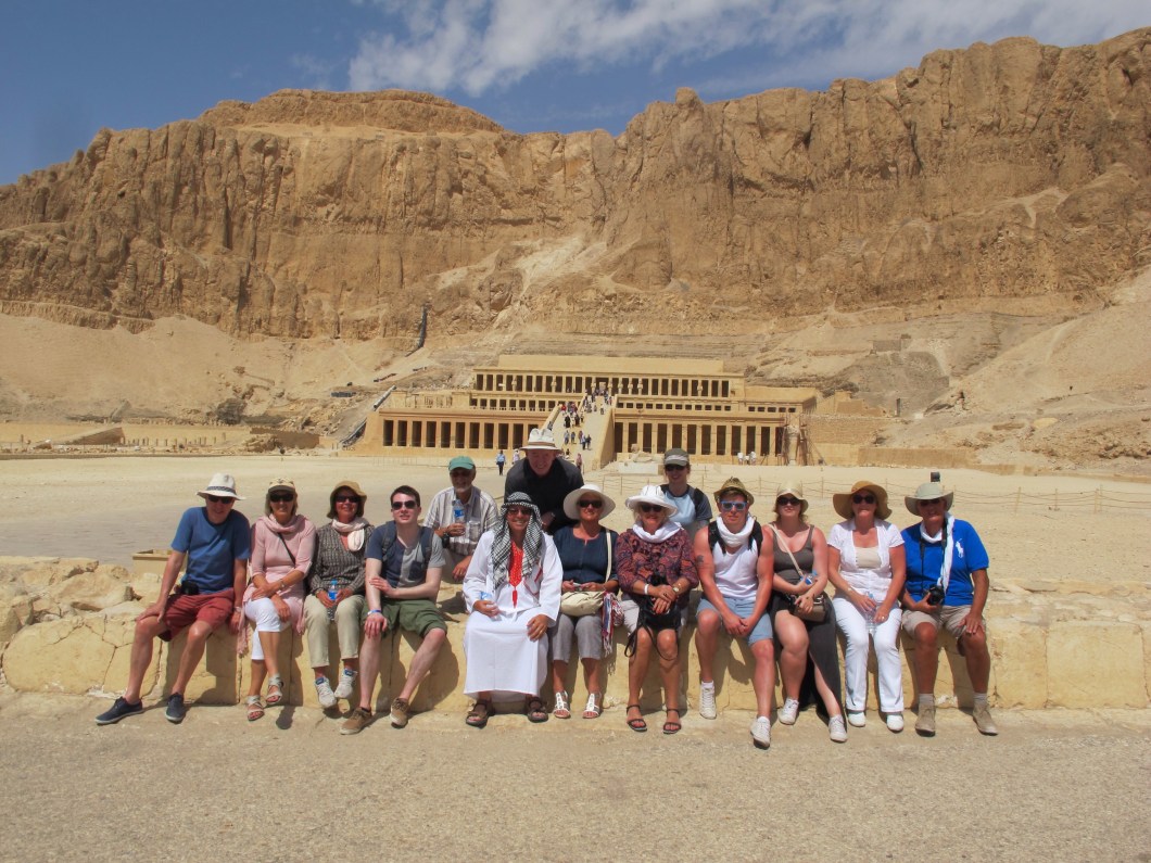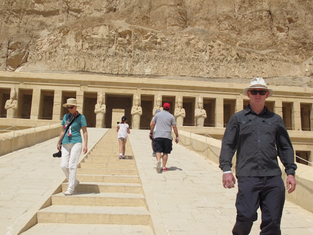 Next stop was the Temple of Queen Hatshepsut … a huge terraced temple which was partly embedded in the rock face of Deir El Bahri. I saw some of the finest examples of coloured paintings here. The group did really well to sit for this photo as it was 39 degrees … bloody hot!